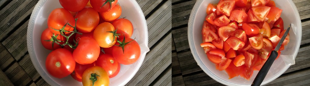 Het was zulk lekker weer! Ik zat lekker op het balkon en begon aan het maken van een flinke pan tomatensaus. Lekker met laurier en rozemarijn van het balkon. Uitje erbij en mooie knoflook. Had ik zeker na het snijden van de tomaten een kleine zonnesteek opgelopen, want de rest van het kookwerk heb ik niet gefotografeerd.
