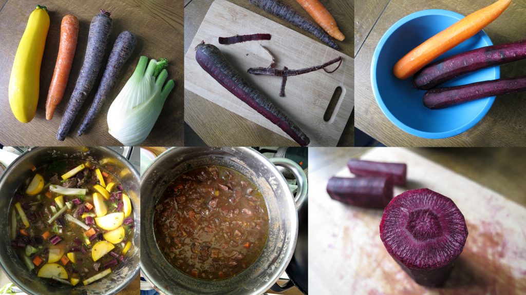 Venkel is al een tijdje favoriet als ik een stoofpotje maak. Het geeft een frisse smaak. En paarse wortels…. Sinds ik ze voor het eerst zag in alle kleuren, ben ik gek op gek op regenboogwortels. Vooral de paarse vind ik heel mooi. Kijk nou naar die mooie structuur in de wortel! Op de markt kocht ik laatst een enorme bak met paarse wortels voor 1 euro. Ze ook hele mooie gele courgettes en venkeltjes. Dus voilĂ ! Mooie mix voor een stoofpotje.