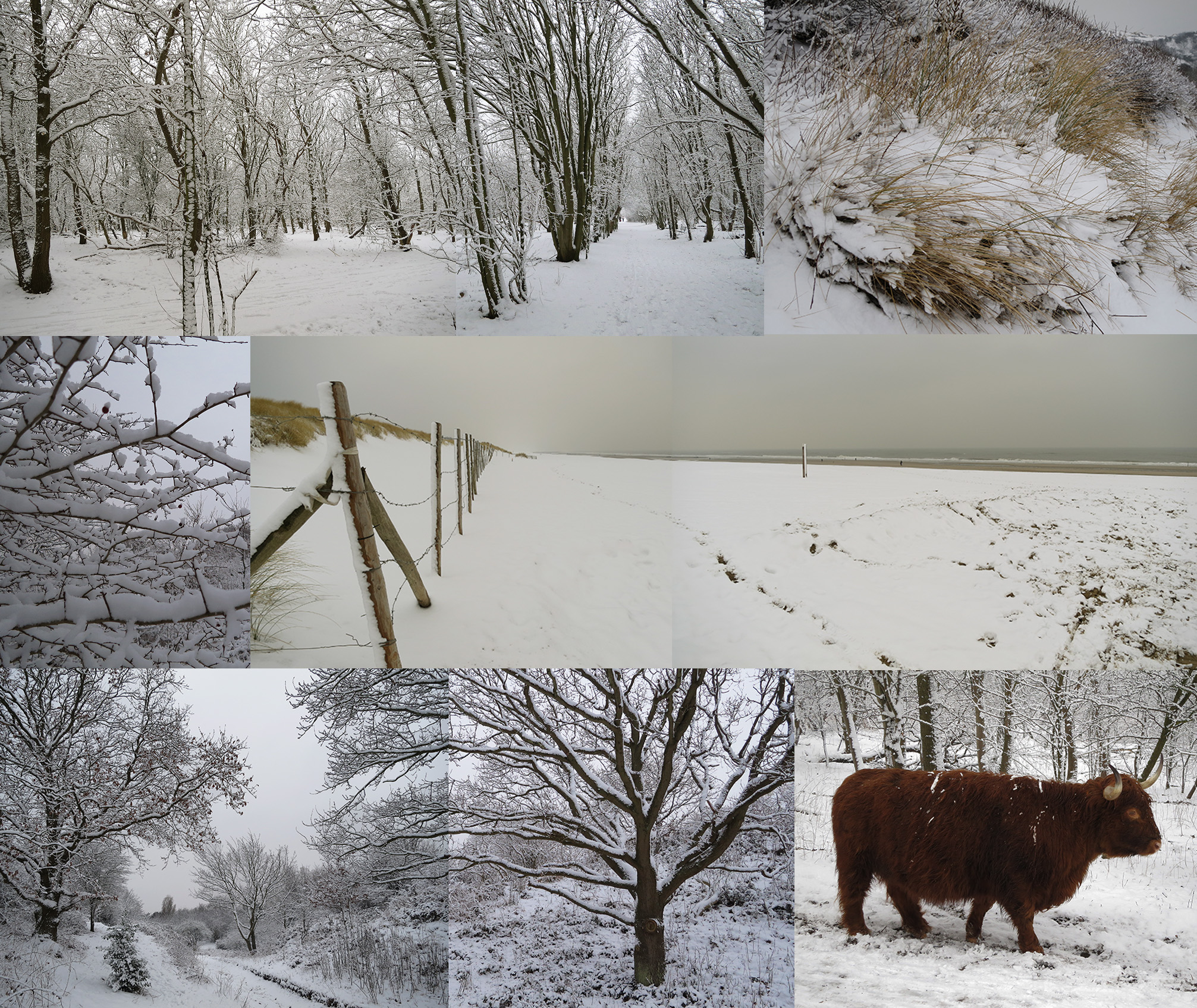 Ik ben dol op sneeuw! Eindelijk, ja eindelijk, was er weer sneeuw. Het bleef helaas niet lang liggen. ‘s Middags was het al weer weg. Maar dit kan niemand ons meer ontnemen. Prachtige plaatjes van het Westduinpark. Overal sporen van konijnen en vossen en… koeien.