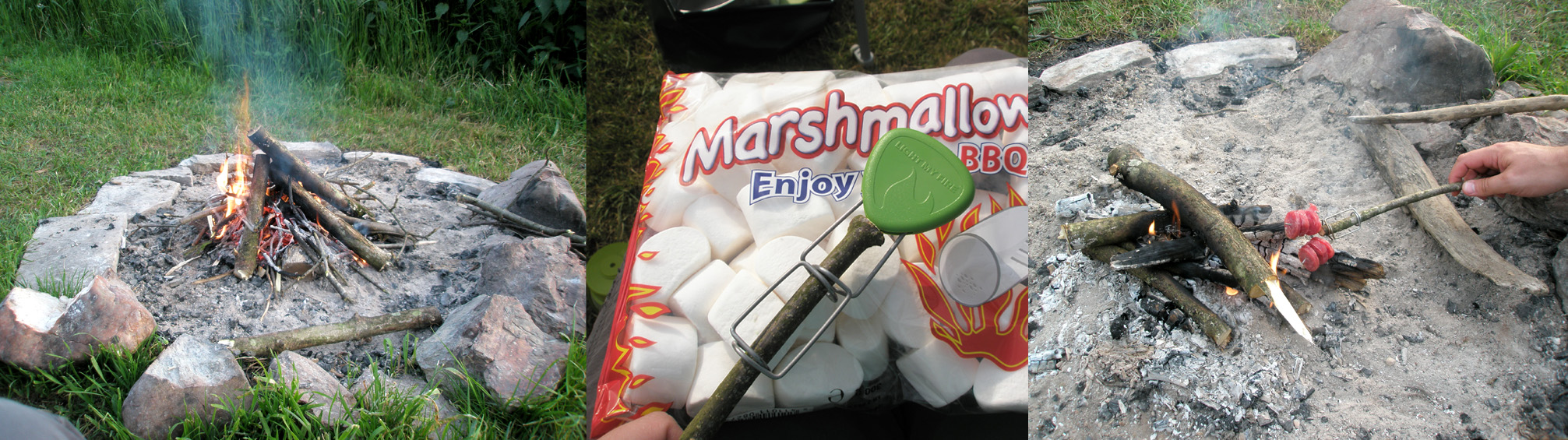 En speciaal voor de gelegenheid 2 mooie hulpstukken gekocht waarmee je van een gewone tak een spies kunt maken. Handig voor de marshmallows, maar ook voor knakworsten en andere worstjes. Een geroosterde marshmallow is trouwens niet aan mij besteed. Maar volgens betrouwbare bron gaat het met Franse veel beter. Wie weet!