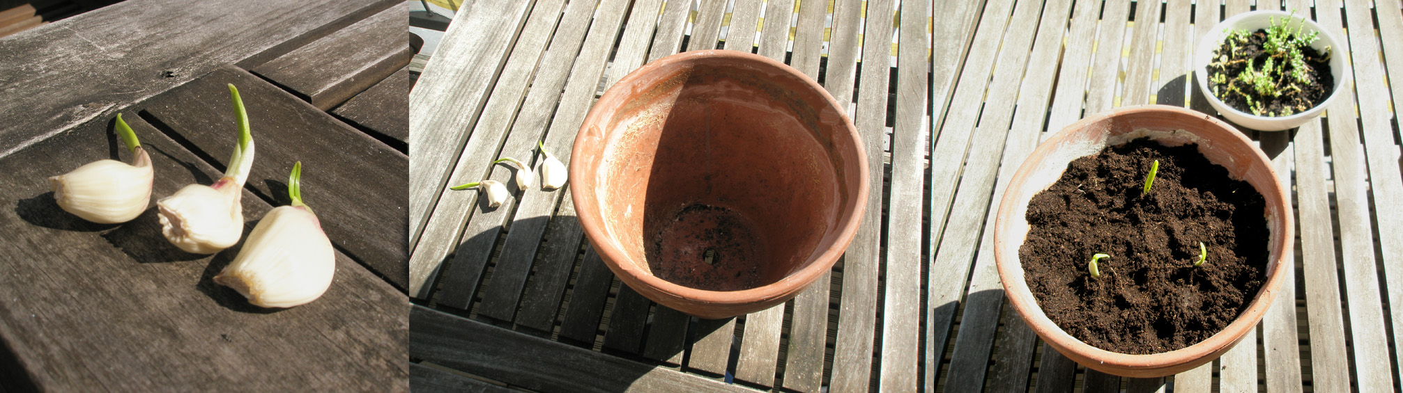 Weer een experiment! Alhoewel ik misschien eerst even wat onderzoek had moeten doen.Ik had nog wat knoflook teentjes die op half zeven hingen en zonder het potje al aan een groeispurt waren begonnen. Dus waarom ze niet in een potje zetten? Jammer dat je er dan later achter komt dat je knoflook in het najaar moet uitzetten, omdat er eerst vorst overheen moet (net als bij bloembollen) en ze pas echt snel gaan groeien als de dagen weer langer worden. En dat laatste kan ik op dit moment echt niet bewerkstelligen.