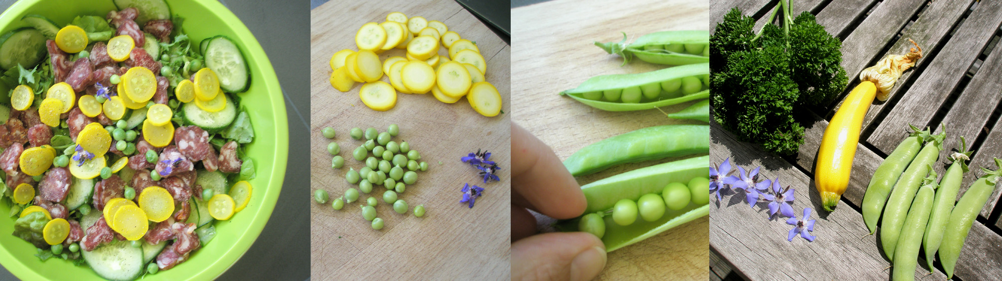 Mmm… vandaag de eerste oogst van mijn stadslandbouwproject. Mijn eerste erwtenpeultjes en een mooie kleine courgette. Beide even snel geblancheerd en heerlijk met wat peterselie (ook van eigen balkon), wat bloemetjes van de komkommerkruid en de worstjes van de Pure Markt in een lekkere salade.