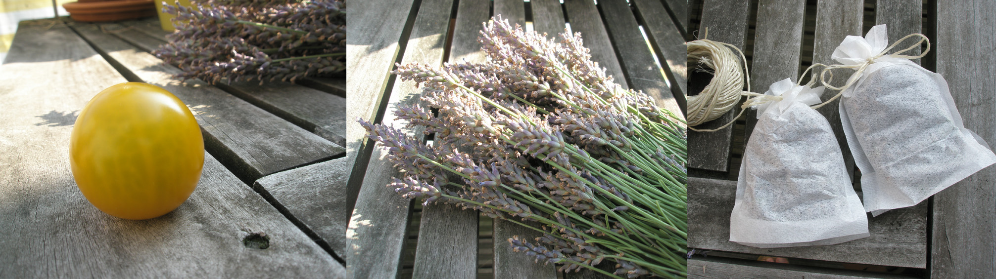 Gisteren heb ik de lavendel gesnoeid en hele schattige zakjes gemaakt met de bloempjes erin. De geur is zo geconcentreerd dat het bijna pijn doet aan je neus. Ruikt heerlijk, zolang je het niet helemaal tegen je neus drukt! En de eerste twee tomaatjes geoogst en geproefd. Mmm… Lekker.