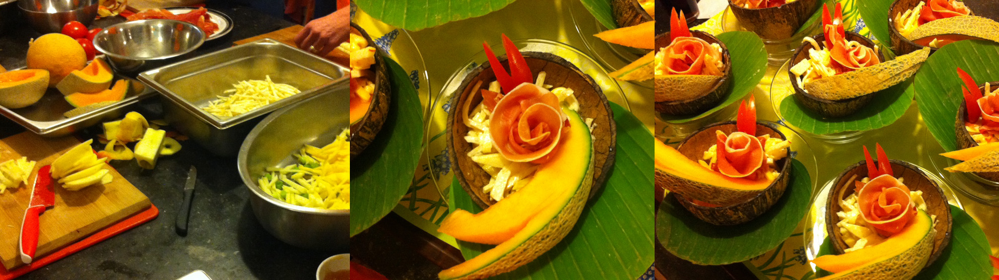 Leuke kooksessie met collega’s gedaan! Deze heerlijk tropische salade was mijn onderdeel samen met nog 5 collega’s. De salade zelf is gemaakt van gesneden gerookte kipfilet, mango, appel, geblancheerde knolselderij, lente-ui, limoensap en wat honing, cajunkruiden, yoghurt en wat peper en zout. De salade wordt gedecoreerd met een puntig gesneden tomatenpartje en een stuk meloen. Heel lekker!