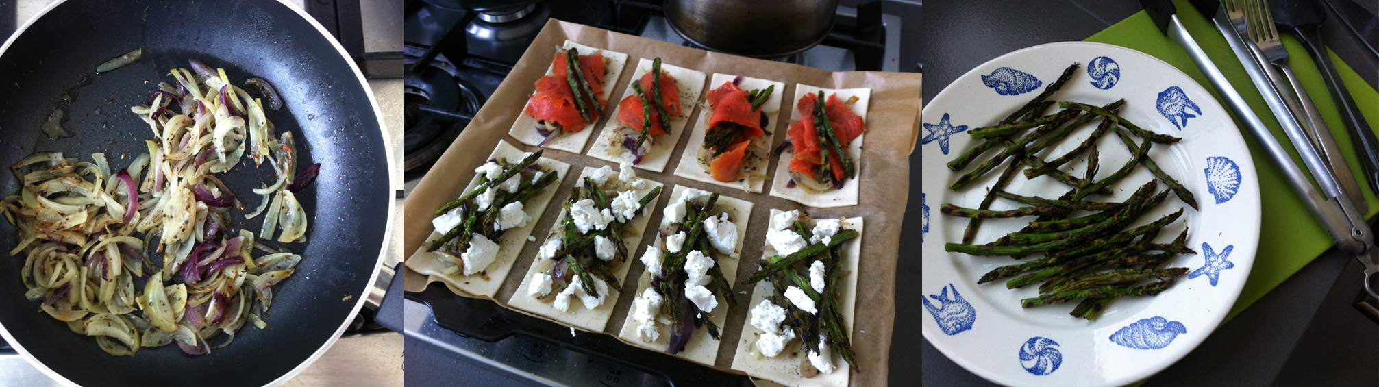 Ik was gisteren wel een beetje in een kookbui. Dat heb ik wel vaker op vrijdagmiddag. Beetje in mijn kookboeken zitten bladeren, maar ik had gewoon niet zo veel zin in een hoop gedoe. Dan is dit recept een uitkomst. Lekker makkelijk en gewoon met je handen opeten. (Zo langzamerhand begint het er wel op te lijken dat ik ‘s werelds meest luie kok ben, maar goed!) Hoeveelheden maken in dit geval niet uit. De basis zijn uien in reepjes gesneden (wit, rood, wat je wilt) die een minuut of 10 zachtjes hebben staan fruiten met wat salie. In dit geval heb ik er geitenkaas bij gedaan, wat gerookte zalm en gegrilde groene asperges. Alles op je bladerdeeg, beetje peper en zout en dan ca. 25 minuten in de oven op 180ºC. Jummie!!