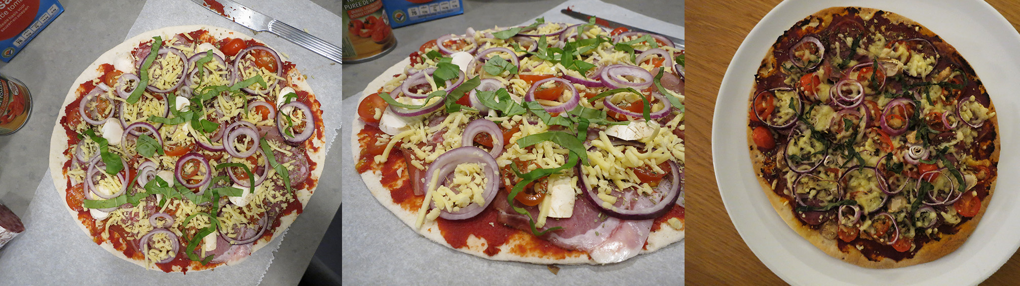 Laatst vond ik in de supermarkt glutenvrije wraps. Leuk, want ik mis wraps en tortilla’s sinds ik glutenvrij eet. Toen kreeg mijn vriend het goede idee om ze als pizzabodem te gebruiken. En dus de test: zeker geslaagd. Ik had op de mijn naast tomatensaus wat ham en worst, tomaatjes, uienringen en lekker veel kaas. Jummie.