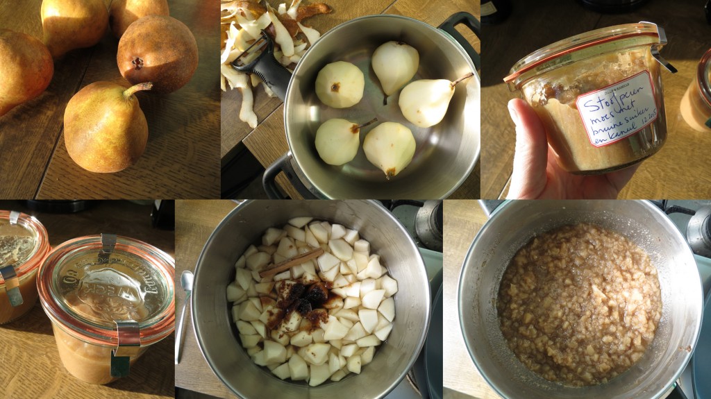 Laatst een heerlijk diner gemaakt met Boeuf Wellington, aardperensoep en stoofpeertjes. Echt heel erg jummie! Twee jaar terug heb ik een kookthermometer voor mijn verjaardag gekregen en die heb ik nu voor het eerst op een flink stuk vlees uitgeprobeerd (voor jam en gelei is ie ook heel handig). En het werkt! Zonder die thermometer was de boeuf nooit zo mooi uit de oven gekomen. We hebben er met vijf personen heerlijk van gegeten. Maar, en nu kom ik bij het onderwerp van deze blog, ik had nog wat stoofpeertjes over. Dus wat doe je daar dan mee. Nou, ik dacht dat een moes van stoofperen wel moest kunnen. Ja, de peertjes zijn hard, maar met tijd worden ze goed zacht. Moet kunnen, toch? En het kan! Door vreemd inkoopmanagement en het samenvoegen van twee keukens is er een enorm overschot aan bruine basterdsuiker in onze keuken en verder geen kristalsuiker meer te bekennen. Dus de peertjes gingen in kleine stukjes met bruine suiker en kaneel de pan in. Dat resulteert in een wat bruine, vage moes, maar lekker is het wel. En het smaakt nog heel stoofpeerachtig ook, zonder dat er rode wijn bij zat!!! Nu nog bedenken wanneer deze lekkere moes een keer op het menu komt.